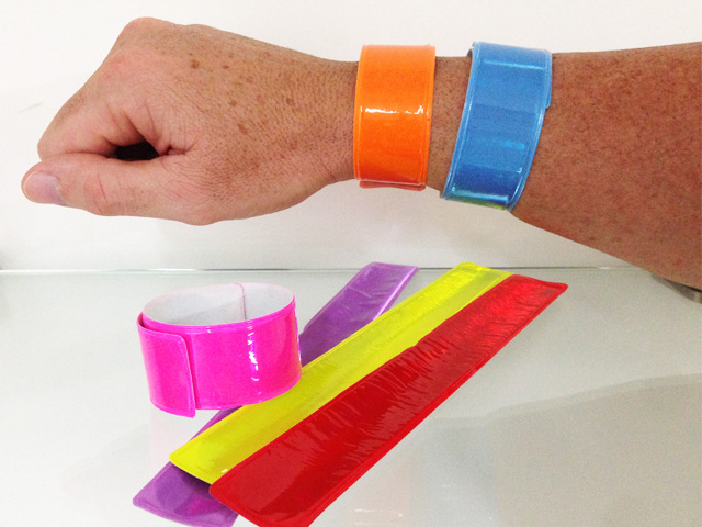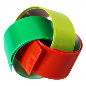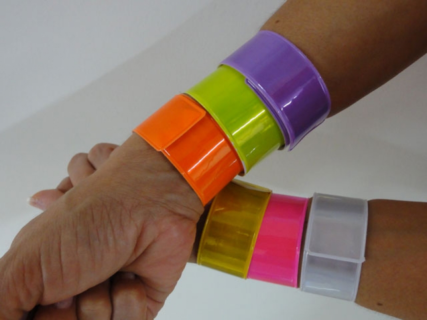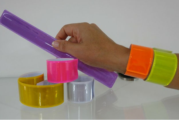 Características: Pulsera Slap Band esta disponible en PVC reflectante con un lado de terciopelo, con una minima placa de acero incrustadopara mayor durabilidad.